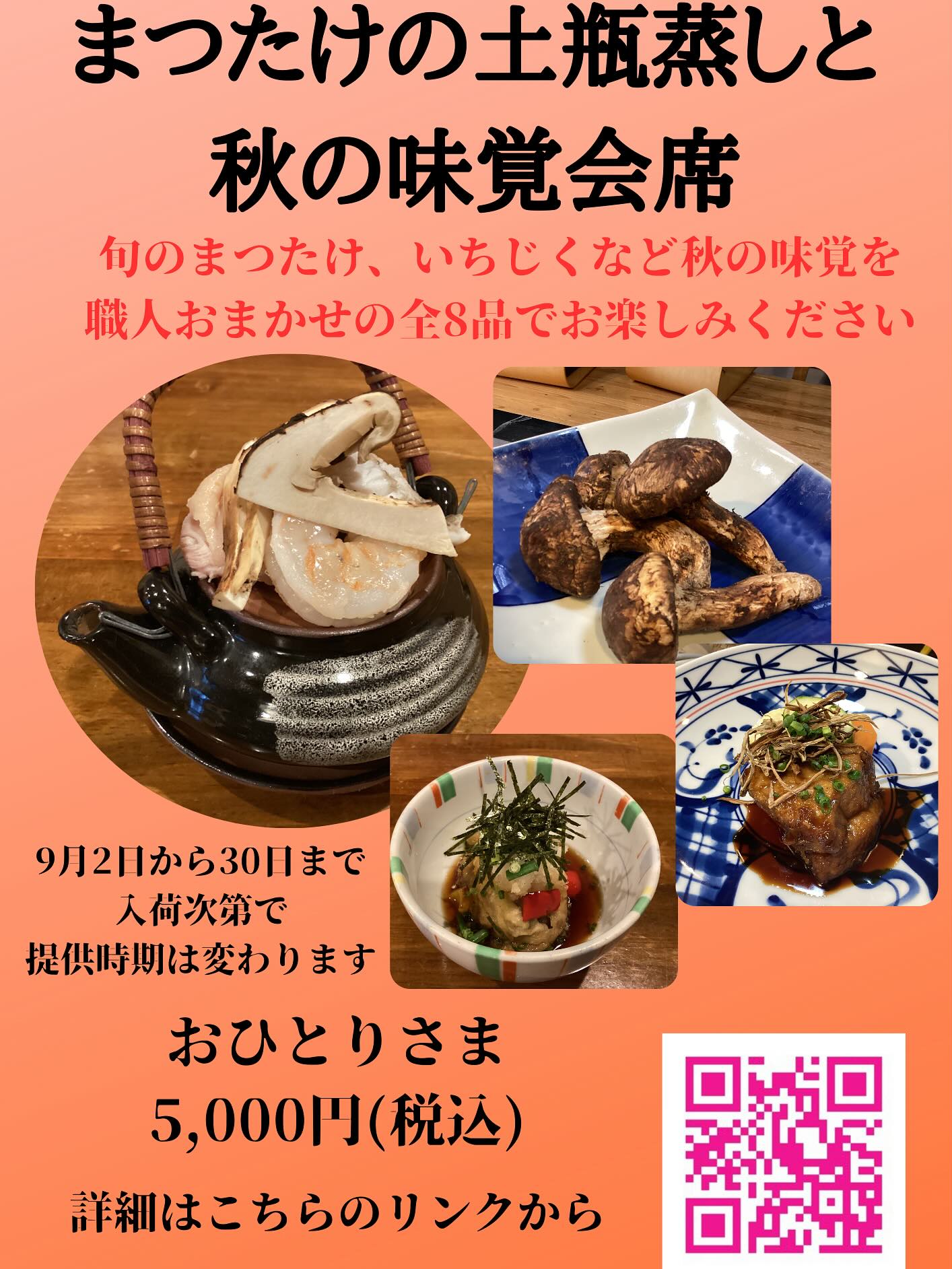 9月は旬のまつたけを贅沢に使った土瓶蒸しをはじめ、秋鯵の...